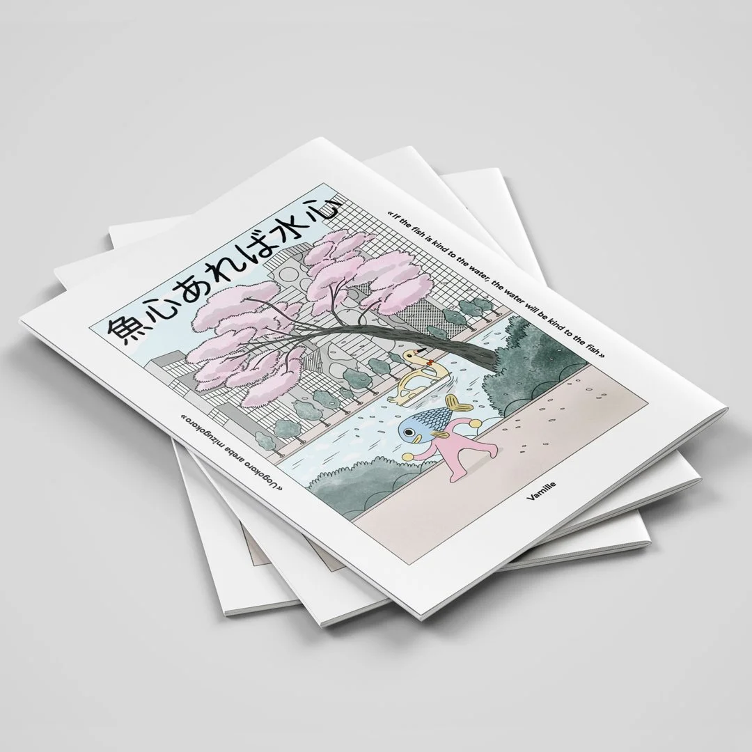 En mars 2023, le premier chapitre de Sakana Kid est prêt! Je l’ai imprimé comme une pré-publication dans l’idée de faire un clin d’oeil au monde éditorial du manga au Japon. Cet ouvrage est l’objet de la première exposition de Sakana Kid à Tokyo à la fin de ma résidence artistique à Almost Perfect.