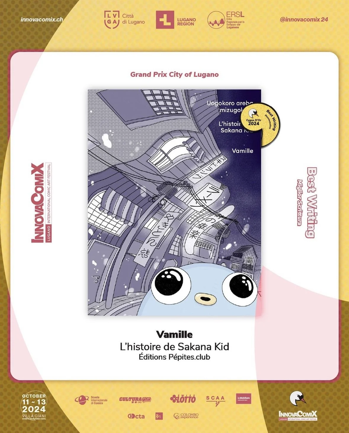 Au mois d’août 2024, “L’histoire de Sakana kid” a obtenu 2 nominations au Grand Prix City of Lugano du festival InnovaComix dans les catégories : “Best Writing” et “Best Swiss Comic”.
