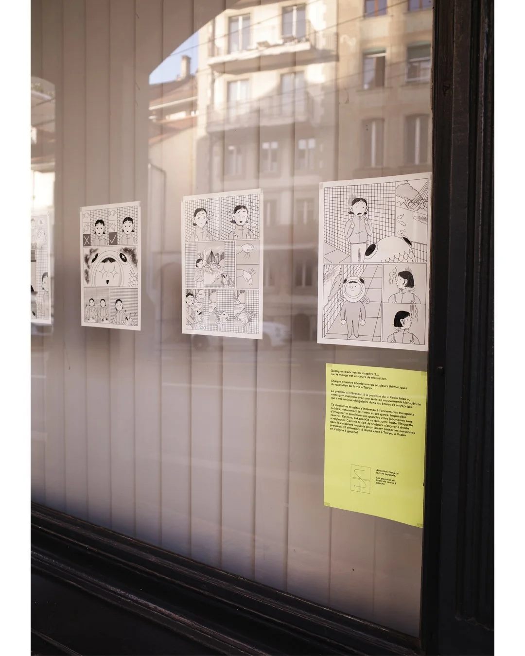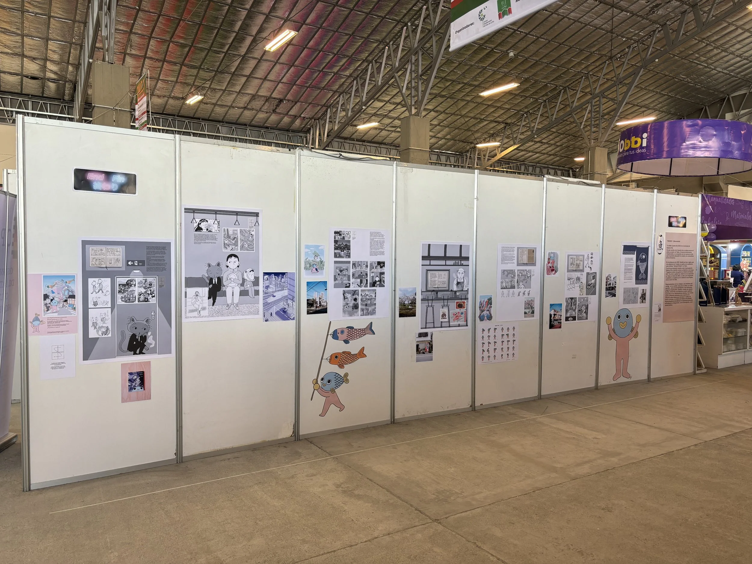 Du 15 au 28 avril 2024 a eu lieu le festival BDFIL à Lausanne. Dans le cadre d’une exposition carte blanche, j’ai pu réalisé un rêve, recréer à taille humaine l’univers de Sakana Kid! J’ai donc imaginé son lieu de naissance, la devanture du restaurant où il aurait pu juste se faire manger. En 5 différentes parties, j’ai retranscrit les thématiques du livre et imaginer une exposition interactive avec la possibilité de repartir avec un petit souvenir réalisé soit-même grâce au stamp rallye. Il était aussi possible de contempler un bout de Tokyo à travers une fenêtre dans le métro et de se prendre en photo façon “purikura” avec les héro.ine.s de L’histoire de Sakana kid.